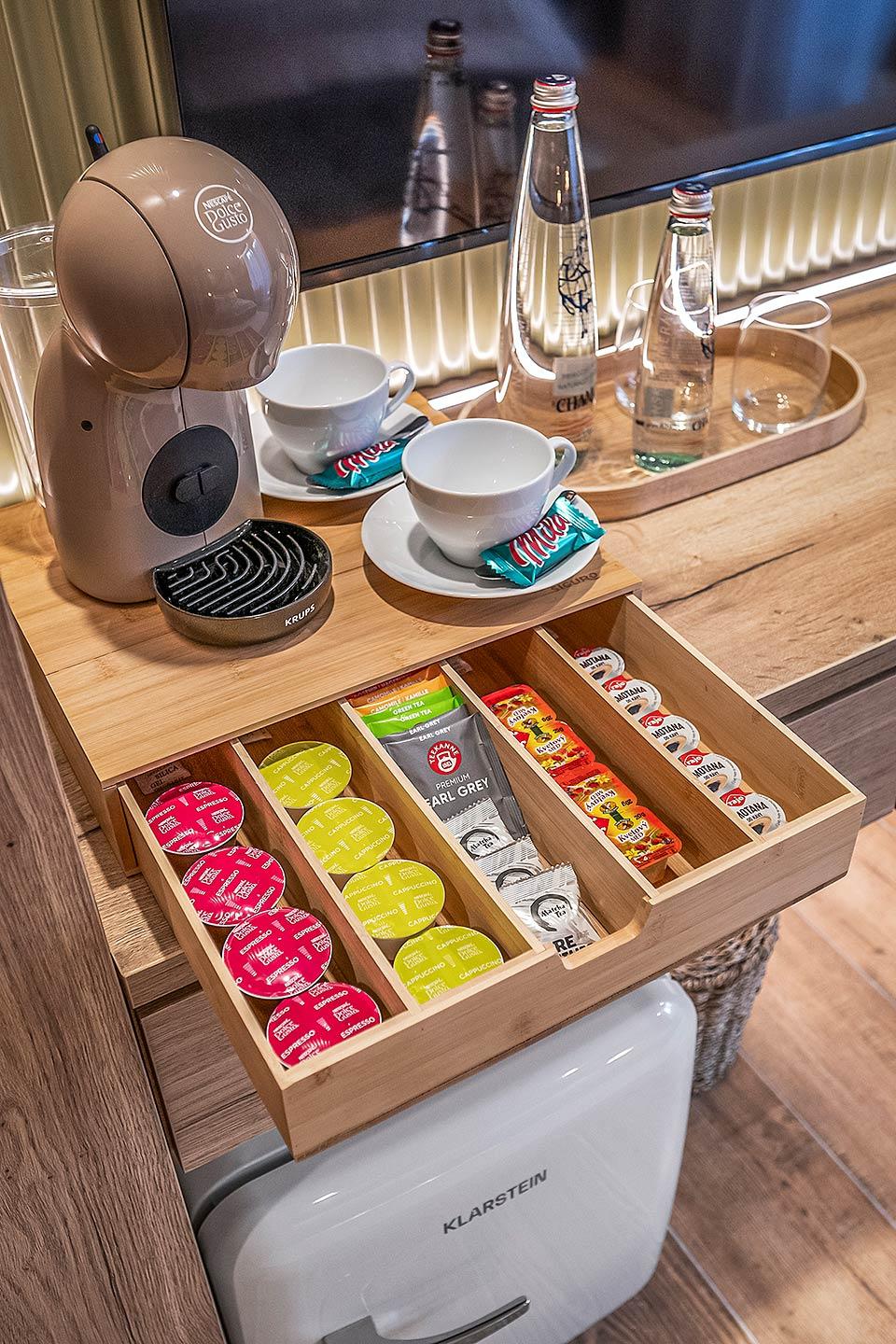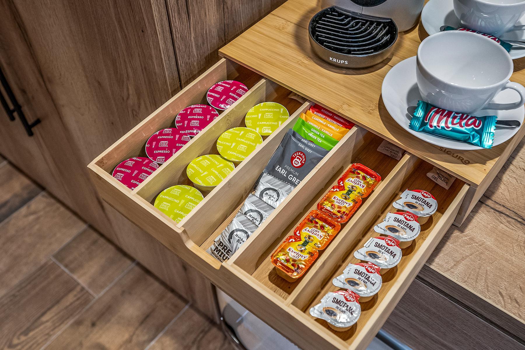 Kávé- és teakedvelőknek: Minden apartmanban kávéfőző, kávékapszulák, teák és a mi egyedi Tátra ásványvizes üvegünk található.
